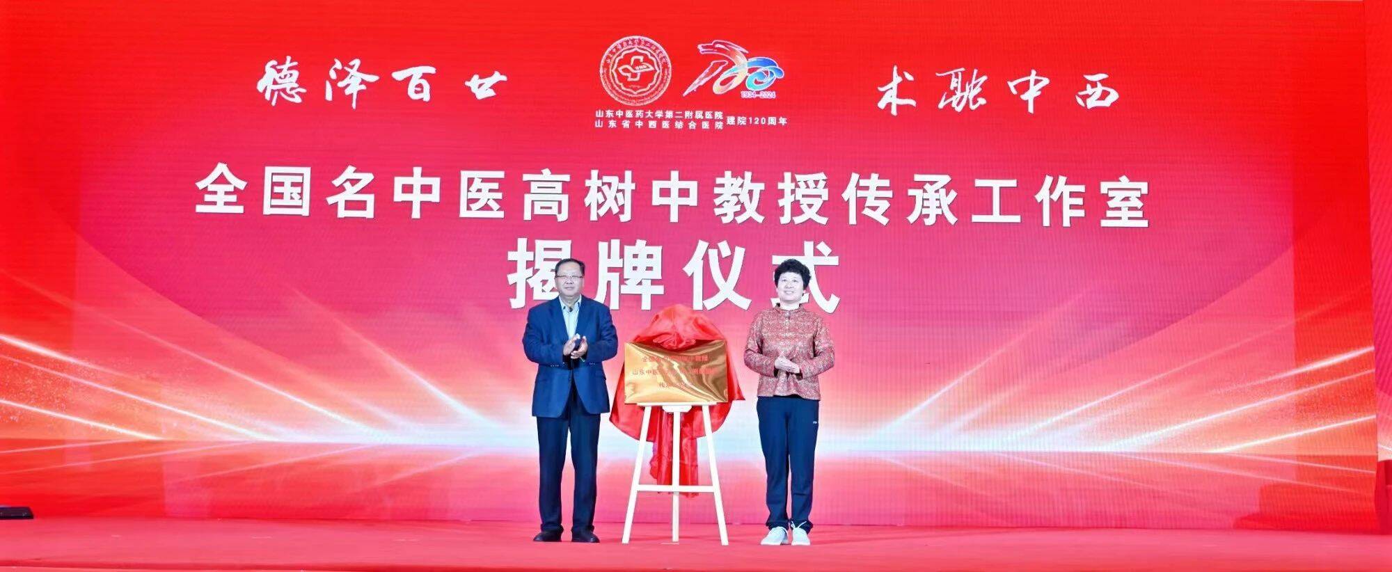 山东中医药大学原校长高树中,原山东省中医药管理局局长、现山东中医药学会会长孙春玲为全国名中医高树中传承工作室揭牌