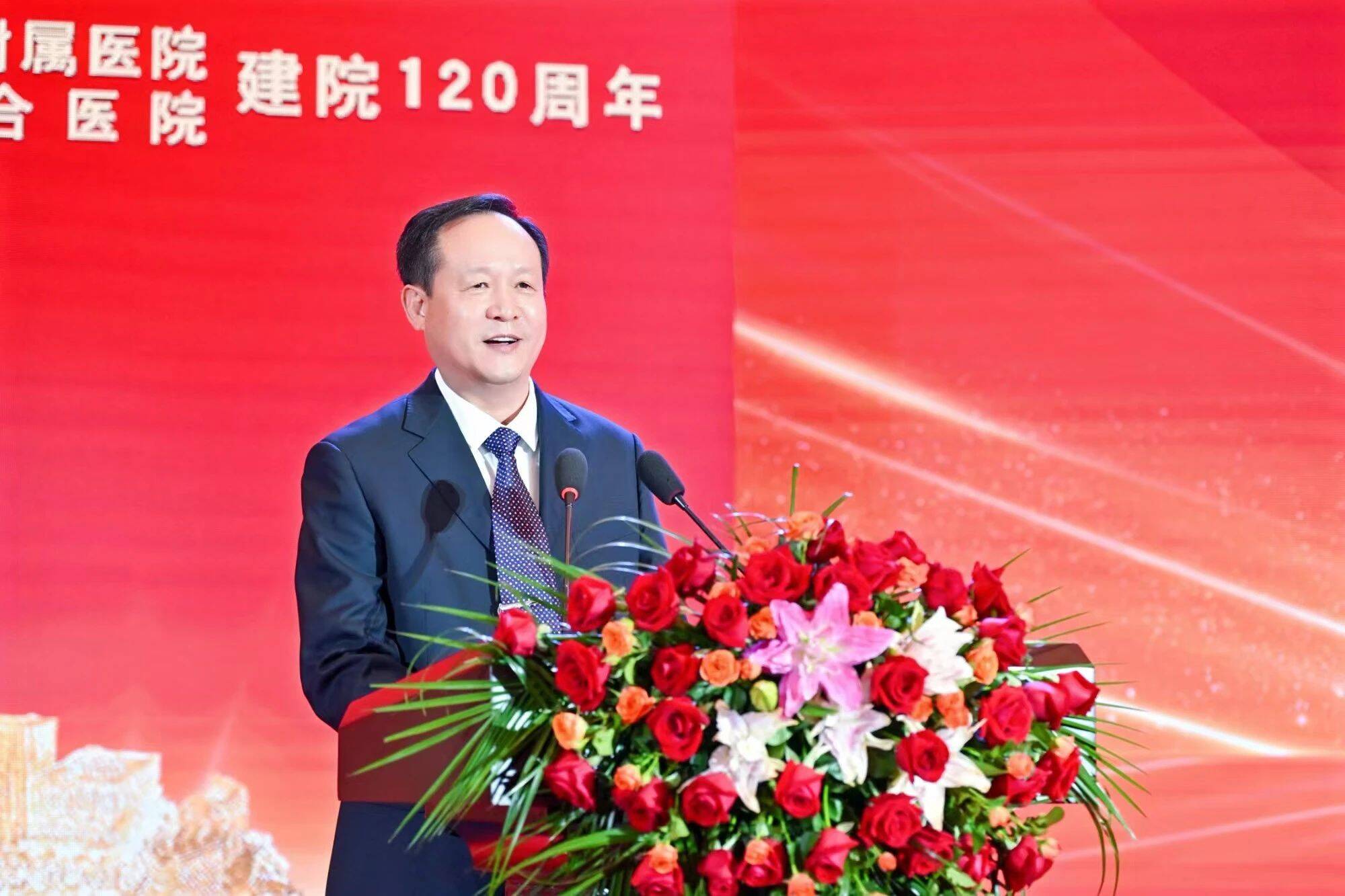山东省人民政府副秘书长薛超文讲话,他对医院建院120周年表达了良好祝愿,并代表省政府对医院建院120周年表示热烈祝贺,向长期奋战在治病救人,教书育人一线的广大医护人员和教职员工致以诚挚问候。他对医院经过多年的发展,不断彰显出的中医药特色优势,成功创建国家中西医协同旗舰医院和国家中医康复中心,在中西医结合诊疗服务、学科建设、人才培养等方面取得的成绩给予了充分肯定。成立以省政府主要领导同志为组长的促进中医药发展工作领导小组,高规格召开全省中医药大会,出台一系列政策措施,推进中医药传承创新发展。他指出,当前我省国家中医药综合改革示范区建设全面启动,中医药事业振兴发展迎来了重要的机遇。要抓住关键环节,集中发力空间,发挥好广大中医医院的促进作用,加快推动我省从中医药大省向中医药强省跨越。他希望山东中医药大学第二附属医院以建院120周年为契机,砥砺奋进,接续奋斗,不断提升医疗服务能力和水平,早日建成集医疗、教学、科研、预防、保健、康复于一体的全国一流现代化中西医结合医院,为保障人民健康,促进中医药事业高质量发展,加快新时代社会主义现代化强省建设作出新的更大贡献。