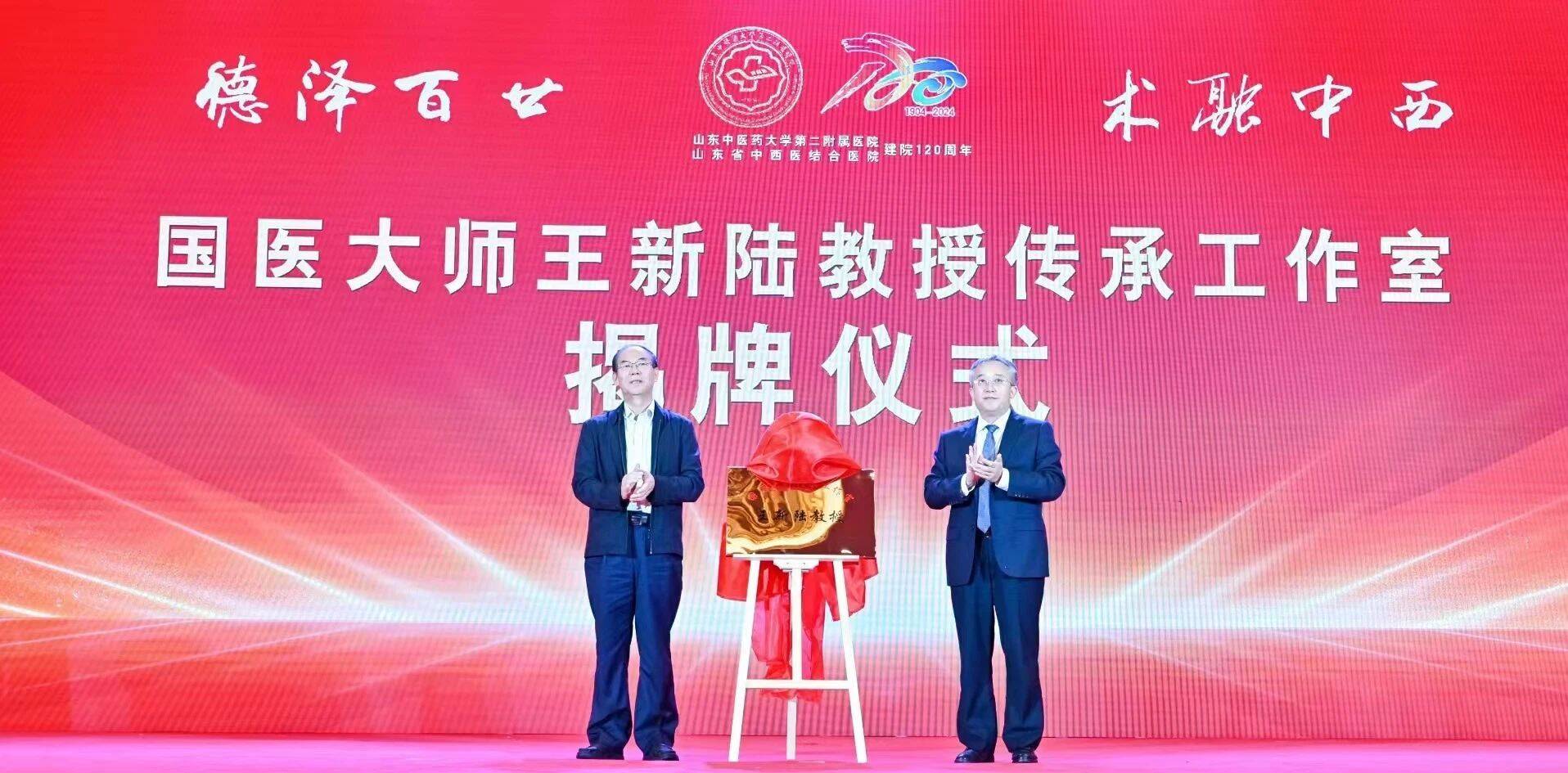 山东中医药大学党委副书记金锋,山东中医药大学原党委书记、山东中西医结合学会会长武继彪为国医大师王新陆传承工作室揭牌