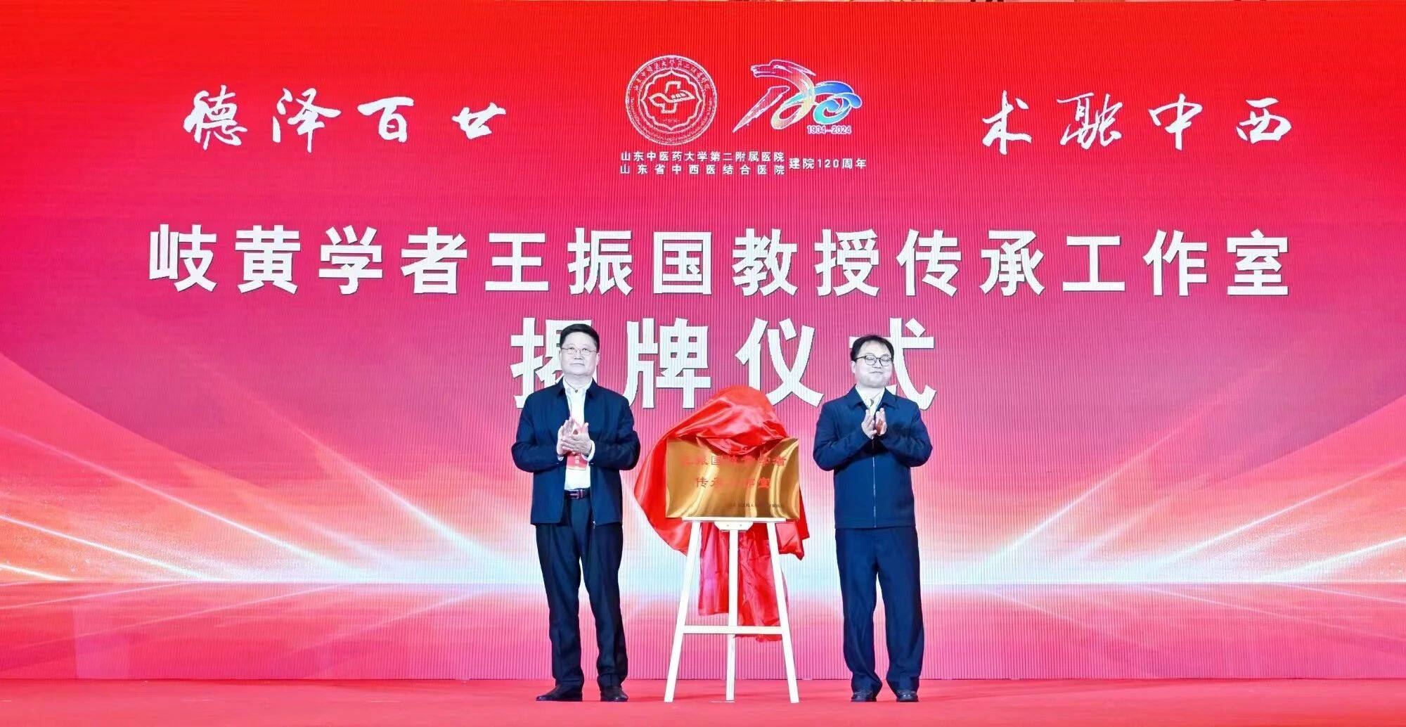 山东中医药大学原副校长王振国,国家中医药管理局人才交流中心(中国中医药科技发展中心)医疗创新处副处长许伟明共同为岐黄学者王振国教授传承工作室揭牌