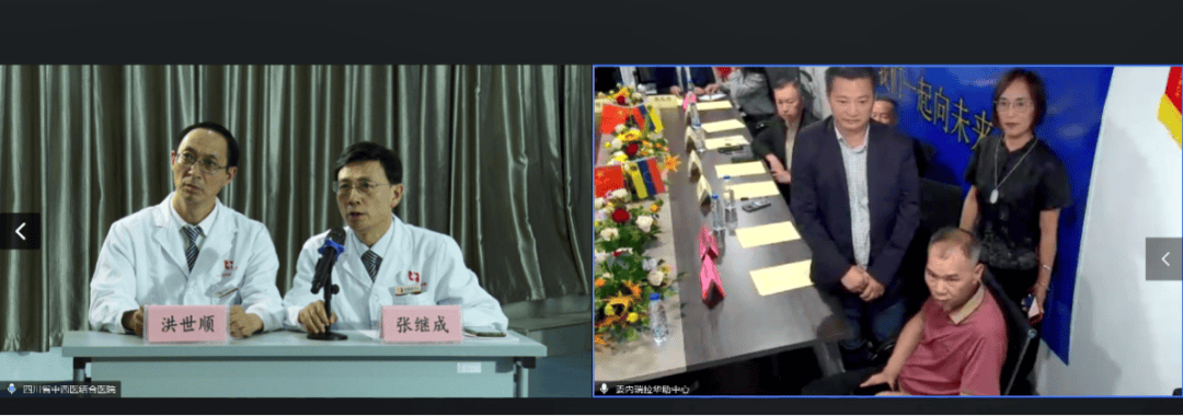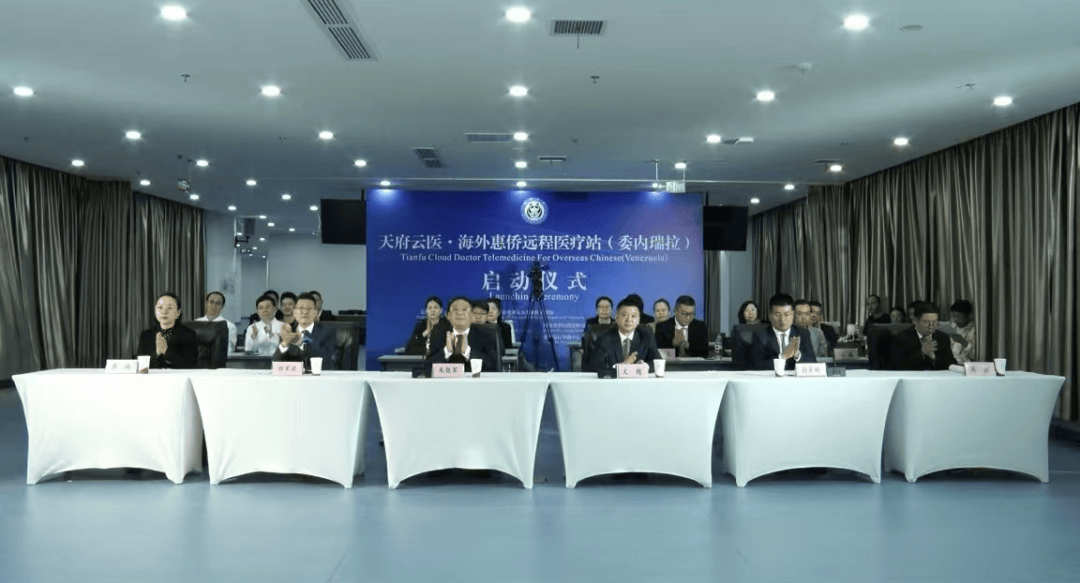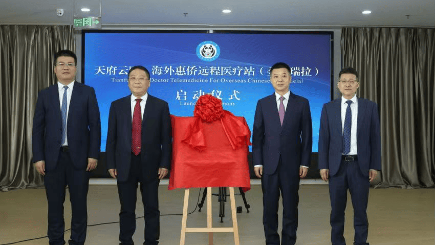 在成都的启动仪式现场,米银军和文甦共同为省中西医结合医院承建的“天府云医·海外惠侨远程医疗站(委内瑞拉站)”授牌。在委内瑞拉现场,张元伟与李锦盛共同为医疗站揭牌。
