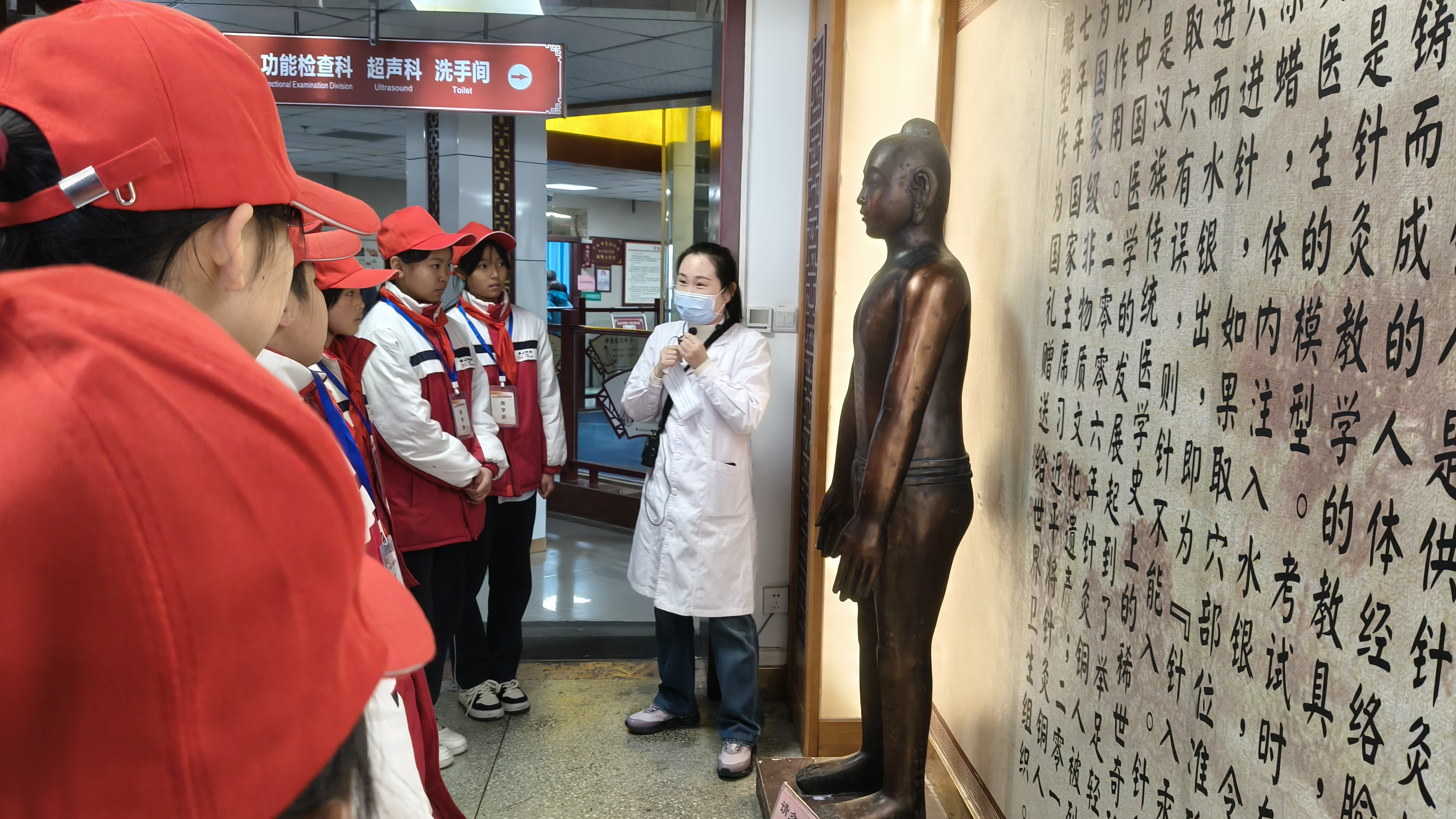 在针灸人体模型前,孩子们首先领略了针灸铜人的风采。这座铜人,身高与成年男子相仿,其外壳可拆卸,胸腹腔亦可打开,五脏六腑的位置、形态及大小比例均精确逼真。铜人身上,刻有三百五十四个穴位,每条经络的穴位名称均详细标注,严格遵循人体实际比例。在针灸推拿科室,孩子们亲手操作脉诊仪,亲自体验不同脉象的变化特征,激发了热烈的讨论。通过近距离的观察与操作,同学们对针灸针、拔罐器具、电针仪等中医器材有了更深刻的认识,对经络腧穴及针灸疗法形成了更加形象化、直观化的理解。