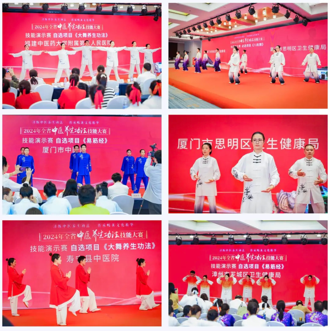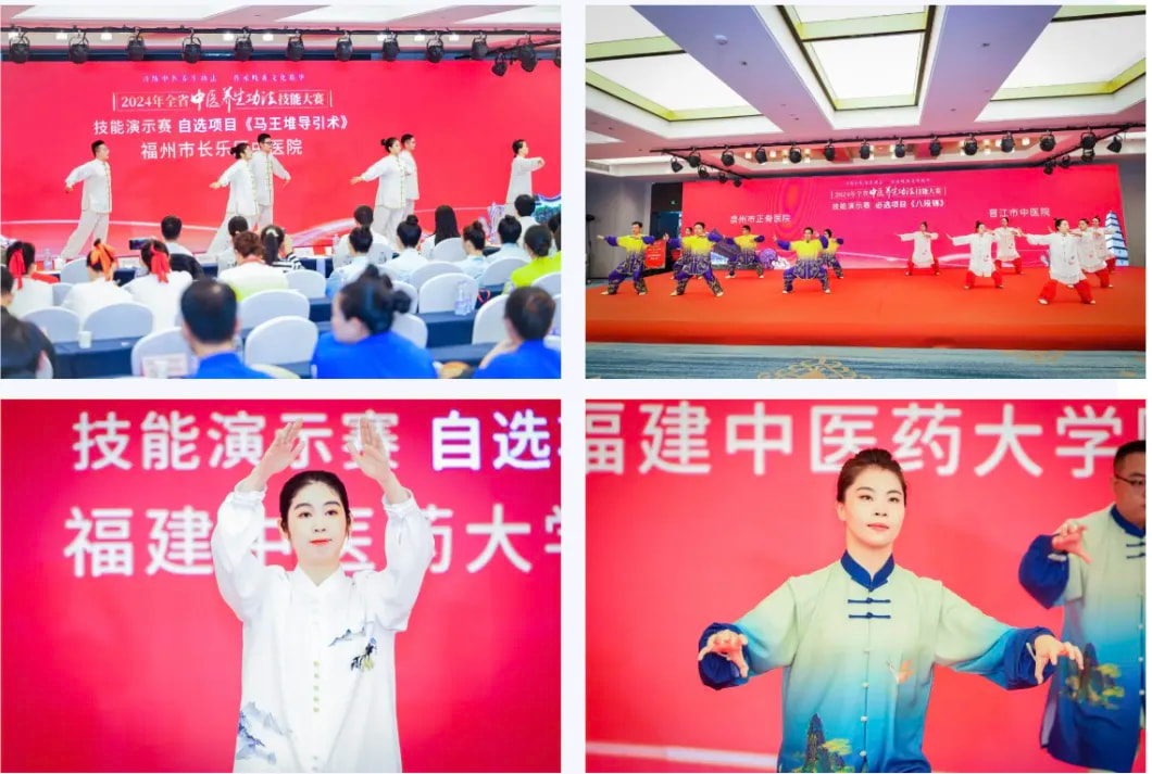赛事分为团体赛和个人赛,包括了视频展播、综合笔试、技能演示、知识竞答等环节。选手们现场演绎了形神融合的八段锦、刚柔相济的太极拳、动静结合的易筋经,以及五禽戏、太极养生杖、导引养生功十二法、马王堆导引术、大舞养生功法等传统中医功法,一招一式尽显中医药传统文化的独特魅力,让人大开眼界、大饱眼福,展现了福建省医务人员创先争优、积极向上的良好精神风貌,奉献了一场精彩绝伦的对决,赢得了现场评委和观众的阵阵掌声。