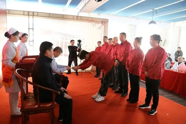 呈拜师帖、行拜师礼、为师傅献花……伴随着古朴的音乐,近日,北京市丰台区中医医院举办“‘天一针法’传承拜师会暨中医药服务模式改革推进会”,来自不同地区的八位中医学徒与“天一针法”创始人李荣刚缔结师徒情缘,开启了一段中医药学术传承的新旅程。