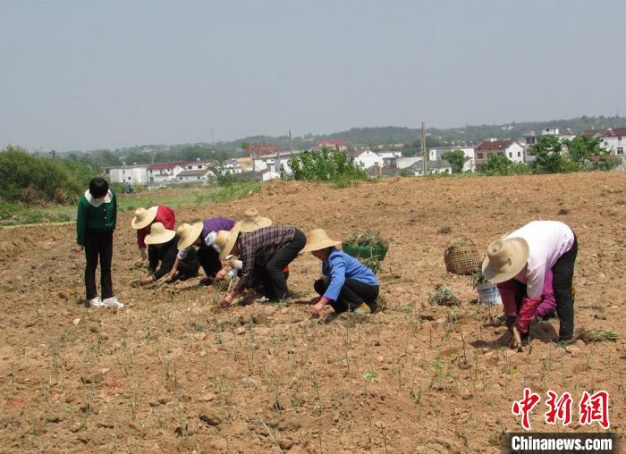 务工的村民正在中药材种植基地里种药材。(桐城市委宣传部供图)