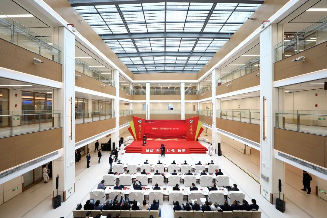 湖州市中医院新院区位于湖州市仁皇山新区,东临安吉路、南临青太路、西临长兴路,占地面积约7.4万平方米,总建筑面积约14.5万平方米,可同时容纳床位800张。项目自2020年6月启动,历经4年多的筹备建设。新院区坚持中医院姓“中”的定位,在建筑风格融合了“中”式庭院的元素,从外观上看,急诊医技楼、治未病培训楼、住院楼、行政制剂楼这4幢建筑单体,每幢楼都呈现一个“回”字,白墙、灰瓦、斜顶的设计尽显江南韵味,内部更是配备了一流的现代化医疗设备。