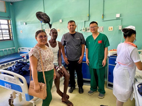 在钱益的主持下,当地医生与中国医疗队麻醉科杜伯祥主任、影像科王林主任多学科讨论,决定为该患者实施选择性左侧肝门阻断下的左半肝切除手术。手术中钱益医生一边仔细分离肝门部的血管和胆管,一边向当地医生讲解着这些操作的技术要领。当通向左肝的血管被逐一阻断后,患者的肝脏表面左、右肝之间出现了一条清晰的缺血线,钱益医生对助手拉姆朱说:“沿着这条缺血线去切除病侧的肝脏能最大程度地减少手术中出血,而且手术中选择性阻断左侧半肝的血流可以不用反复阻断全肝血流,能维护好肝脏的功能避免肝脏手术后出现肝脏功能损伤”,负责手术麻醉的医疗队队长杜伯祥全程调控维持着患者的低中心静脉压,随着钱益医生用中国捐赠的超声刀完全离断了左侧肝脏,手术顺利完成,术中出血不到100毫升。