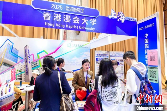 2025 中国国际教育巡回展(上海站)香港浸会大学展位前,该校中医药学院、传理学院、工商管理学院等学院代表以及入学事务处的专业老师在现场向前来咨询的学生家长介绍学校热门专业的课程设置、就业前景、申请要求等。 香港浸会大学供图