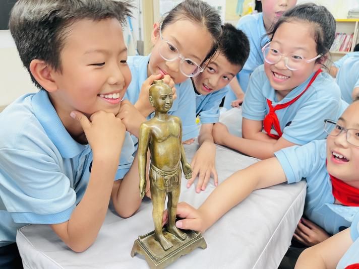 在课堂上,一场别开生面的中医药文化学习之旅正式拉开帷幕。在老师的细致讲解下,同学们了解到针灸铜人在古代医学教学和考核中的重要作用,对古人的智慧和精湛技艺惊叹不已。
