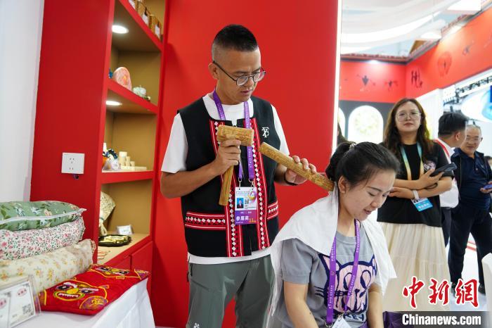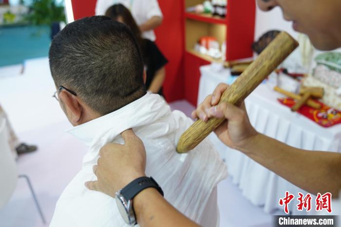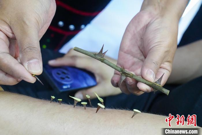 6月21日,观众体验佤族花椒针疗法。中新社记者 刘冉阳 摄