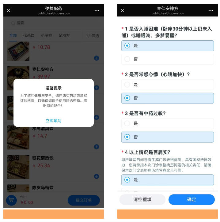 比如,在加购“枣仁安神方”后,需回答睡眠质量、是否有中药过敏等关键问题,确认提交后,即可购买,所购产品将由物流配送上门。
