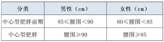 。腰围:中心型肥胖男性腰围≥90;女性腰围≥85。