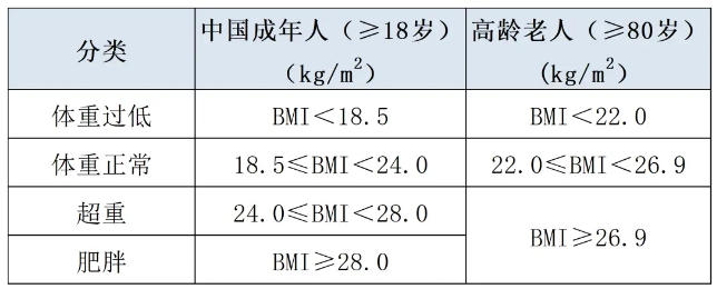 BMI是国际上常用于衡量人体胖瘦程度的一个标准,其计算公式为:BMI=体重(kg)/身高2(m2)。因为高龄老人和成年人的身体状况有所差异,根据我国的《成人体重判定》(WS/T428—2013)和《中国高龄老年人体质指数适宜范围与体重管理指南(T/CNSS 021—2023)》,目前可将BMI分为以下几类: