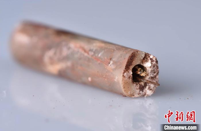 图为海昏侯墓出土的玉管及其内的医用针具。(江西省文物考古研究院供图)