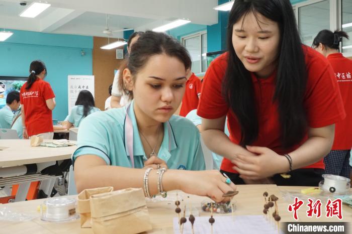10日,美国华裔青少年在成都中医药大学体验合香珠中医药手链制作。陈选斌 摄