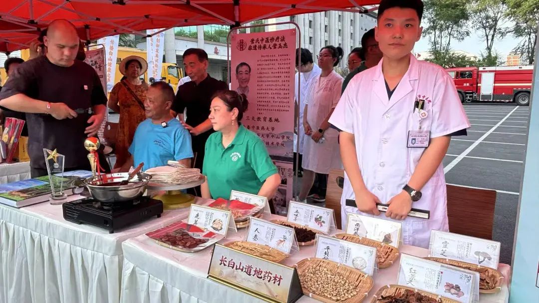 广场中央,“身心和悦”功法展演区气势如虹。数十人形随气动,八段锦的招式如行云流水。“非遗之光”非物质文化遗产展示区则流淌着时光沉淀的匠心——明心堂黑参炮制技艺、管氏中医诊疗法、张氏筋骨膏加工技艺,现场展示中医药技艺,诉说着传承的故事。