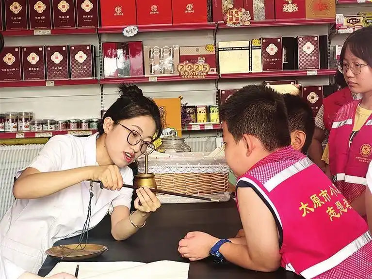 药房器具体验环节中,药师向孩子们演示传统戥秤的使用方法后,大家便迫不及待地动手操作,学习古代与现代计量单位的换算关系。课堂最后,药师为孩子们准备了提前制作好的酸梅汤和八珍糕。孩子们品尝了用乌梅、山楂调制的饮品,以及含茯苓、莲子的美味糕点,知晓了药食同源的有关知识,在孩子们心中播下中医药文化的种子。太原晚报