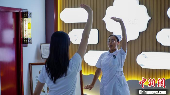 黑河市中医医院外科护士长黄冬妮(右)带记者体验八段锦 颜歆窈 摄