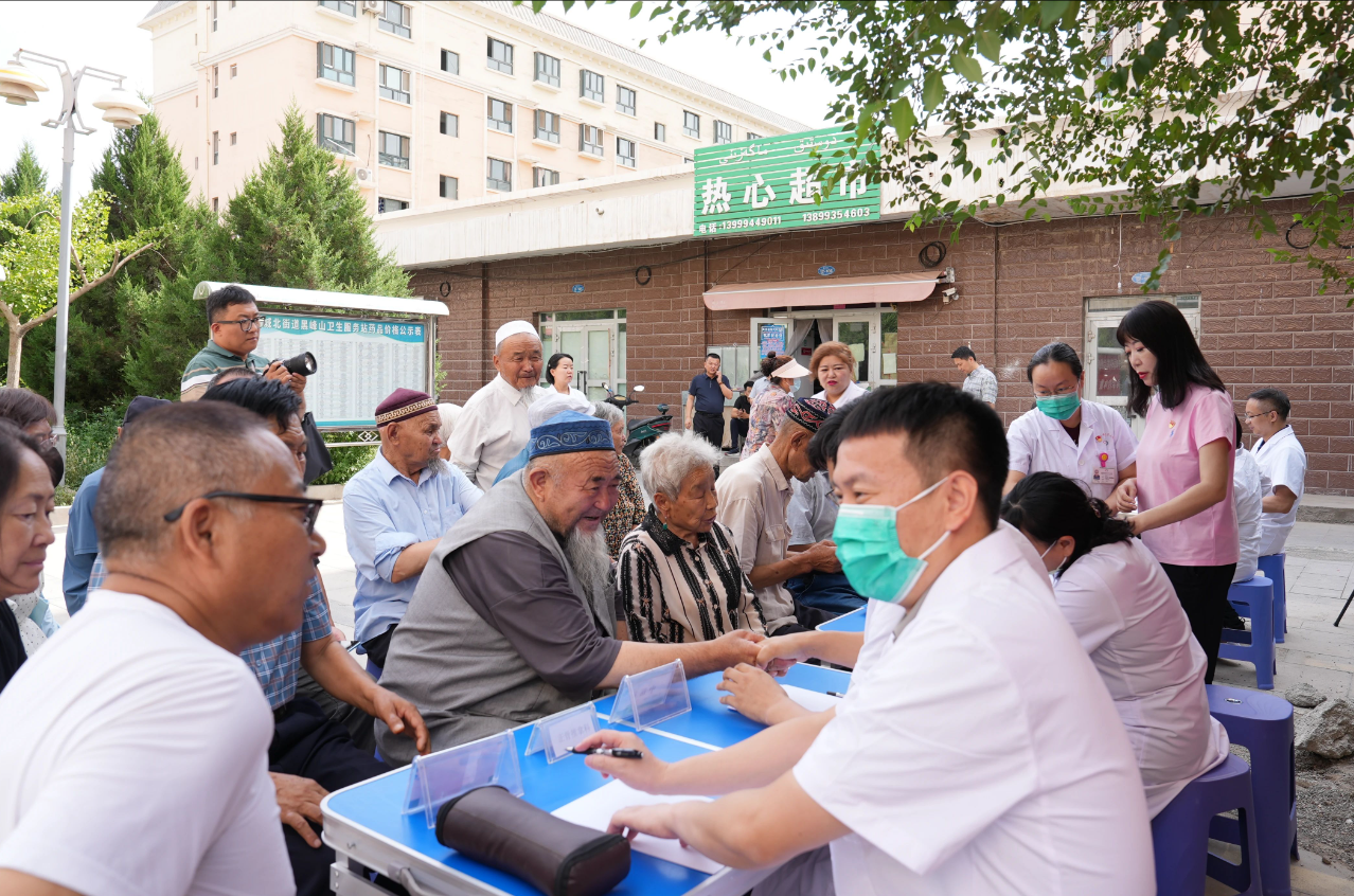 最让老乡们高兴的,还是家门口的义诊。7月16日,哈密市黑峰山社区、白石头乡卫生院迎来医疗专家义诊巡诊。在黑峰山社区,常住着3460位居民,由汉族、维吾尔族、哈族、蒙古族、回族等7个民族共同构成,民族占比达55.6%,多元文化在这里交融。但由于医疗力量配置不足,这里的许多居民都饱受慢性病、疼痛等疾病的困扰。