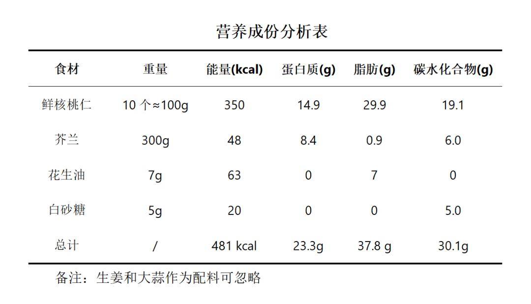 芥兰,又名芥蓝,为广府人家的常用鲜蔬,其味美,能得苏东坡撰“芥蓝如菌蕈,脆美牙颊响”之诗句赞美,民俗智慧更认为其具有下虚火,袪肠热的作用。核桃,《随息居饮食谱》载其“甘温。润肺益肾,利肠,化虚痰,止虚痛,健腰脚,散风寒,助痘浆,以劳喘,通血脉,补产虚,泽肌肤,暖水藏”,享“果中能品”之美誉,为秋冬鲜果,滋补佳品。两者相合,一清一补,正合岭南秋天滋补养生智慧,适合大众及素食者秋天保健食用。