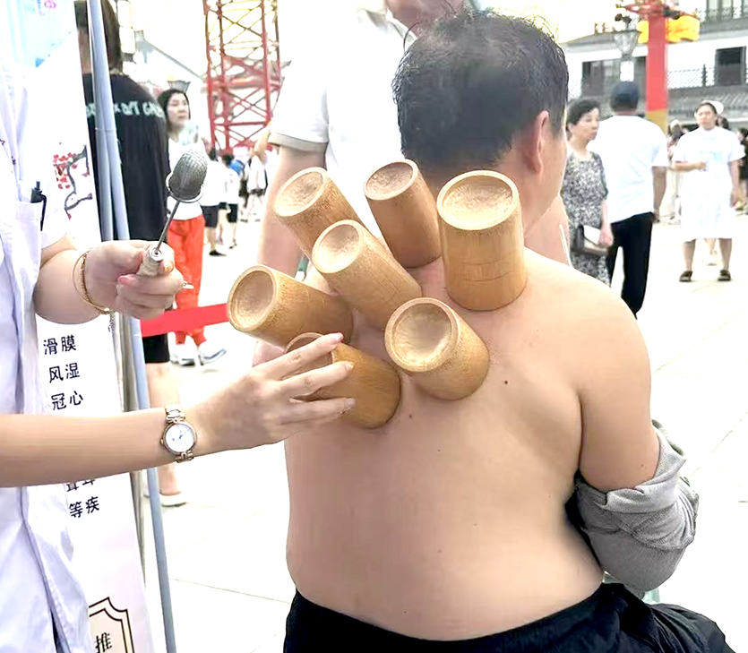 “药香慧柳城”中医药文化活动上,市民体验拔罐疗法。