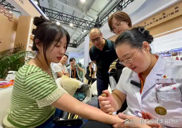 记者在服贸会健康卫生服务展馆厦门市中医院展台体验耳穴埋豆。徐诗瑜摄