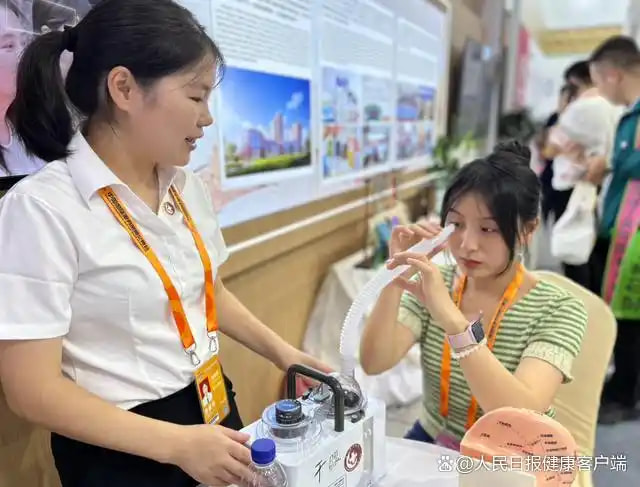 另一个展台上,静静放置着一台中药超声雾化机器。作为传统中药熏蒸疗法和超声雾化结合的产物,这一技术能够将药液转化为气雾。中药液香气氤氲,拿起管道对准眼睛,就能缓解干眼症状。