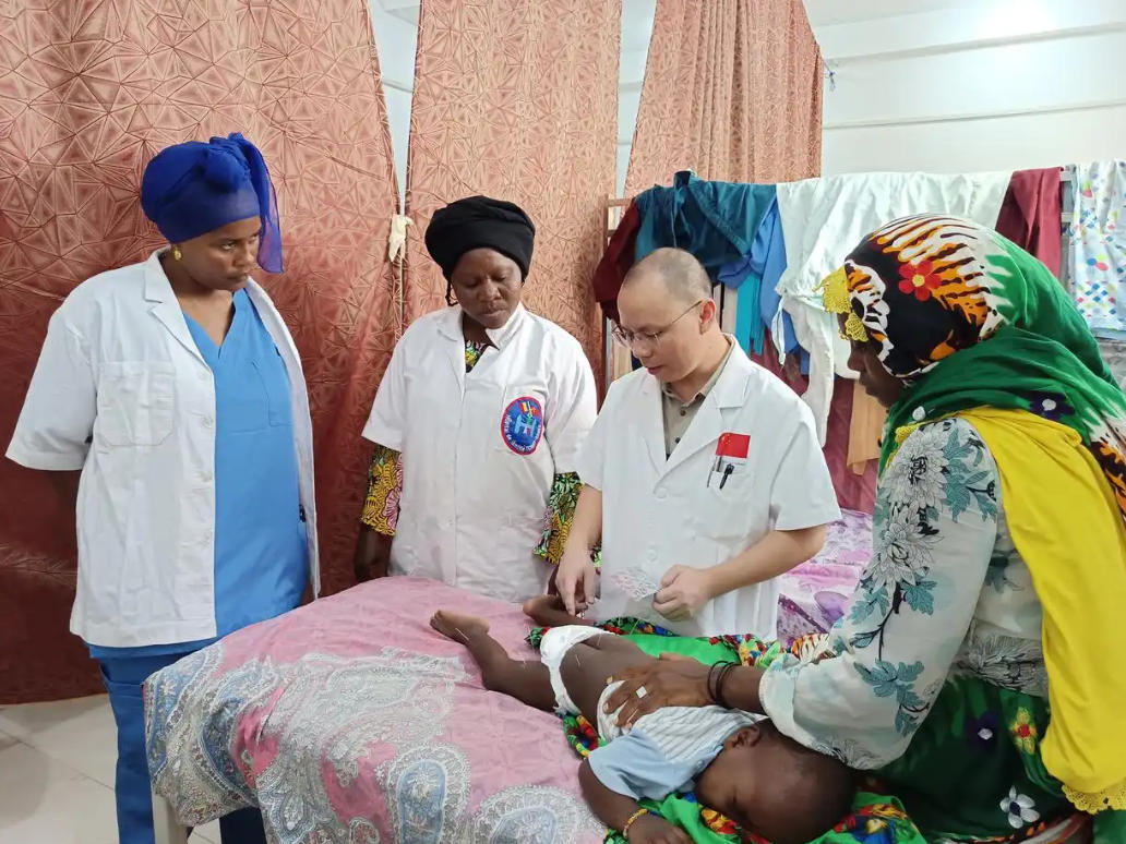 2025年8月,在中乍友谊医院针灸科治疗室,第20批援乍得中国(江西)医疗队针灸科医生谢能翔为患儿治疗并指导当地医院医务人员。(受访者供图)