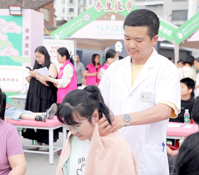2025年5月,娄底市中医医院在体育公园广场开启中医药健康夜市,18个特色展区点亮夏夜。中医体质辨识区内,市民通过问卷与舌象、脉象采集,几分钟即可获取详细体质报告;名中医坐诊区排起长队,专家耐心答疑;中药材辨识区,药师手把手教市民“看形、闻味、触感”辨别薄荷、艾叶等药材。中药茶饮展示区,罗汉果茶获市民称赞,自制膏方、药枕展台前,药师讲解配伍原理。中医特色治疗体验区,针灸、推拿等疗法吸引上班族,90后小陈体验后说:“长期对着电脑,颈椎僵硬得像块铁板,医生帮我扎了几针,瞬间轻松了!中医不是‘老古董’,年轻人也需要这种‘潮养生’!以后我要多学中医养生知识,少熬夜、多调理。”
