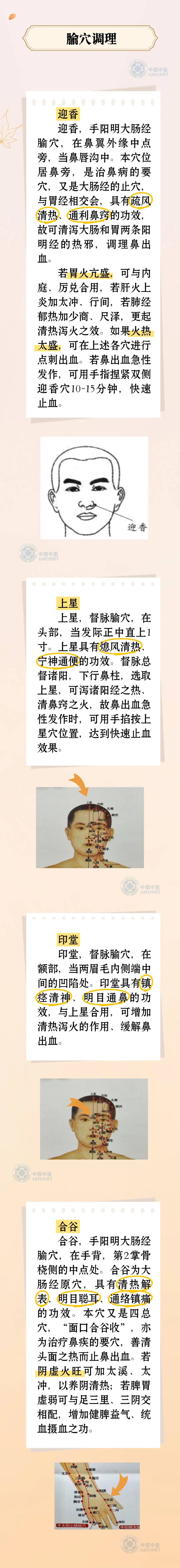 肺开窍于鼻,与秋气相通应,秋季气候干燥,鼻出血是秋季常见的病症之一。根据“急则治其标”的原则,针对正在鼻出血的情况,可以采取压迫、冷敷等方法快速止血;对于反复发作者,日常也可按揉迎香、上星、印堂、合谷等腧穴,调整脏腑、经络虚实,“缓则治其本”,预防鼻出血。