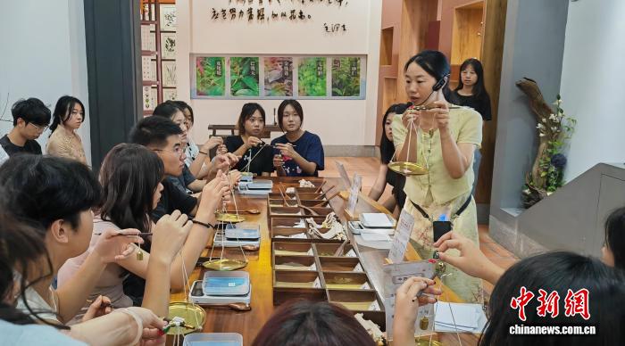 在漳州卫生职业学院“闽南文化工坊”中医药文化研习课堂,一行人深入了解闽南传统中医药技艺,在专业老师指导下体验制作香囊、针灸推拿,并前往药用植物园学习辨识部分药用植物。