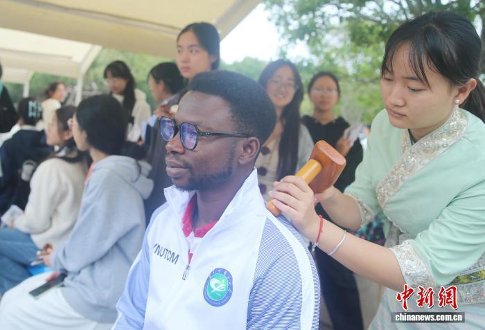 10月22日,一名尼日利亚留学生体验傣医锤经。中新社记者 黄兴鸿 摄