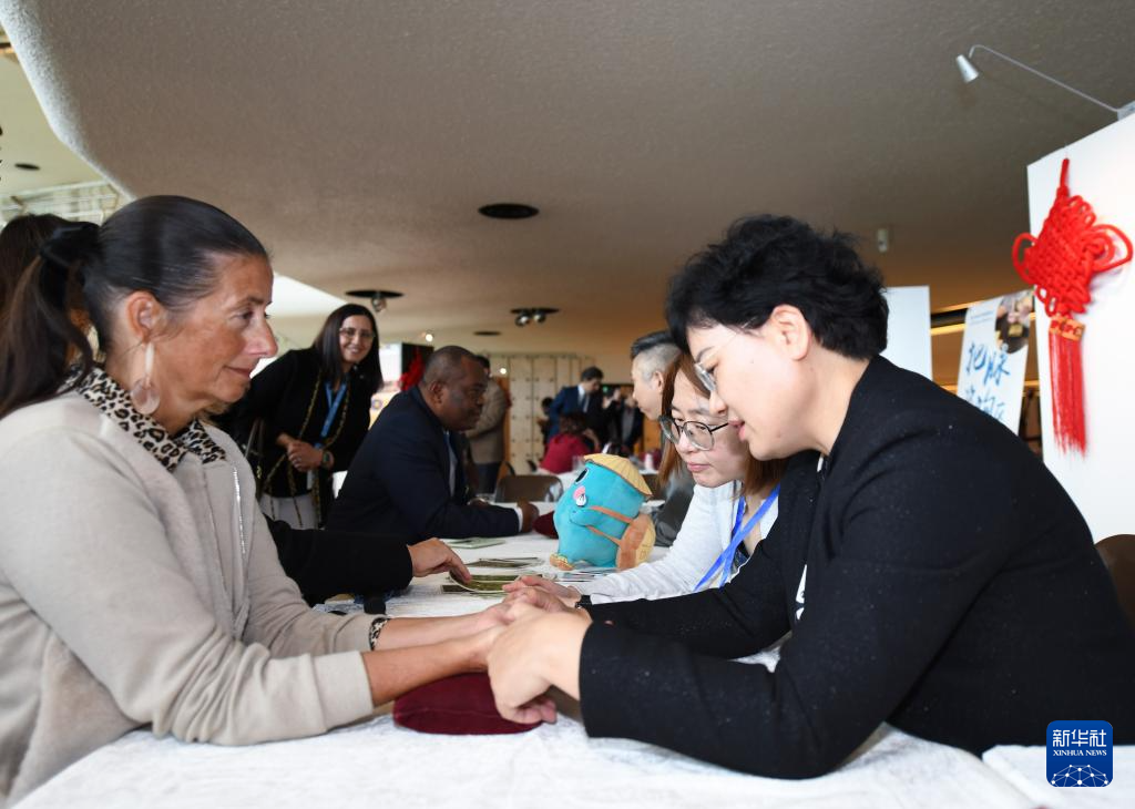 10月28日,在瑞士日内瓦举办的“中医药走进万国宫”活动中,一名女子体验把脉。新华社记者 连漪 摄