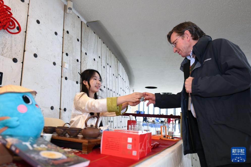 10月28日,在瑞士日内瓦举办的“中医药走进万国宫”活动中,一名男子品尝中国茶。新华社记者 连漪 摄