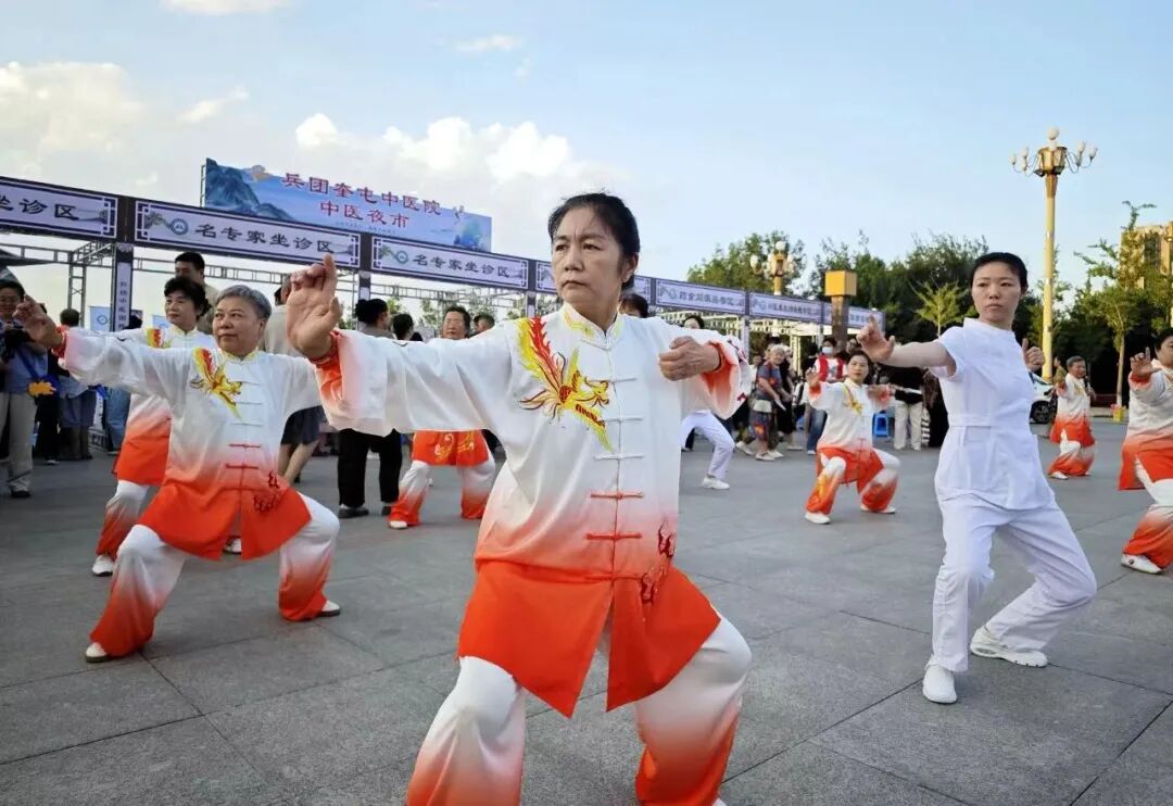 第七师胡杨河市活动现场,工作人员习练八段锦。