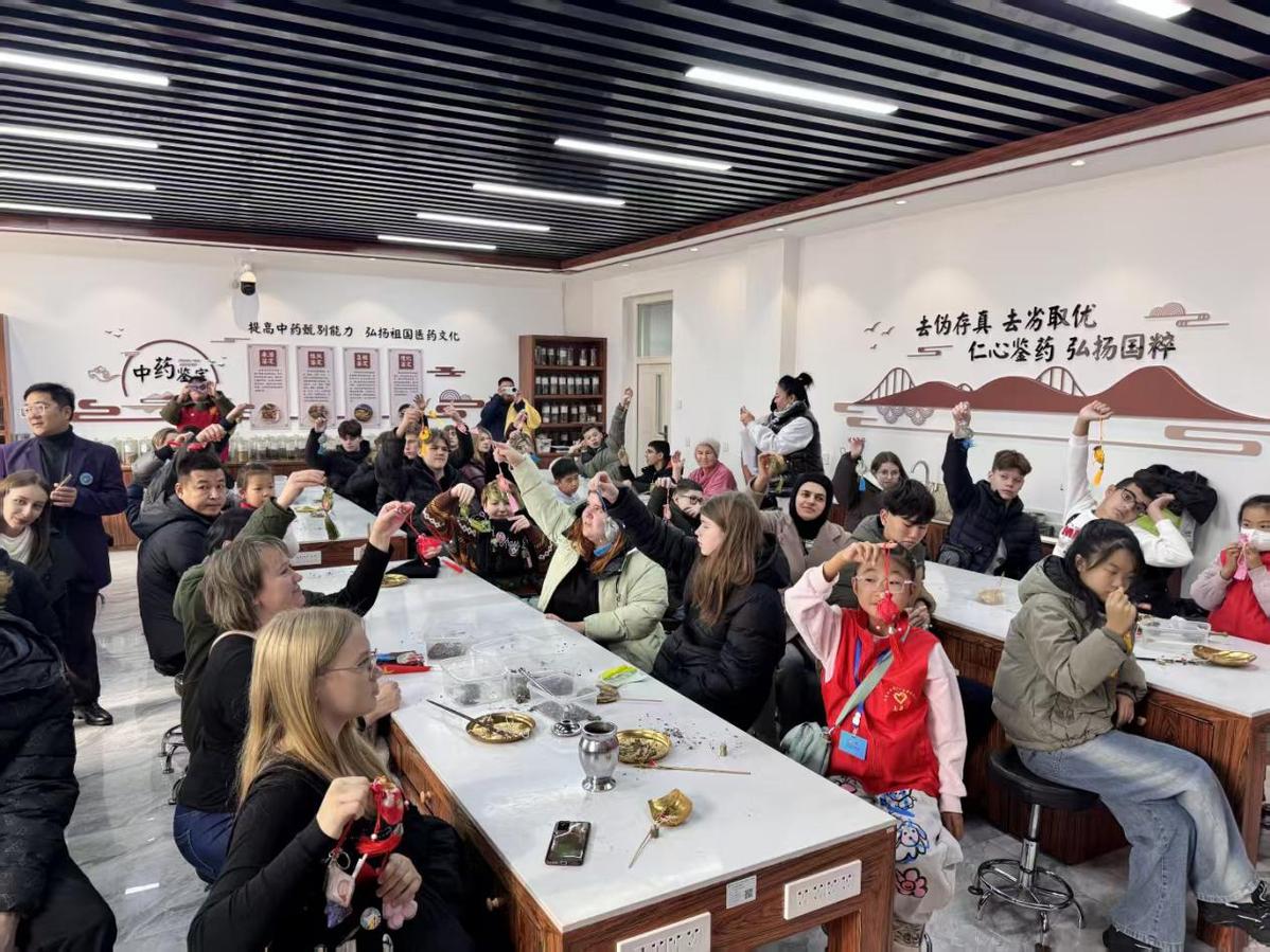 活动最后,中俄师生共同进行手作体验,通过亲手操作戥秤、冲筒等传统中药工具,将所识之药、所感之香,精心制作成独一无二的中药香囊。在称量、捣药、装袋的过程中,草药的芬芳弥漫开来,中医药文化也随之沁入中俄青少年的心田。