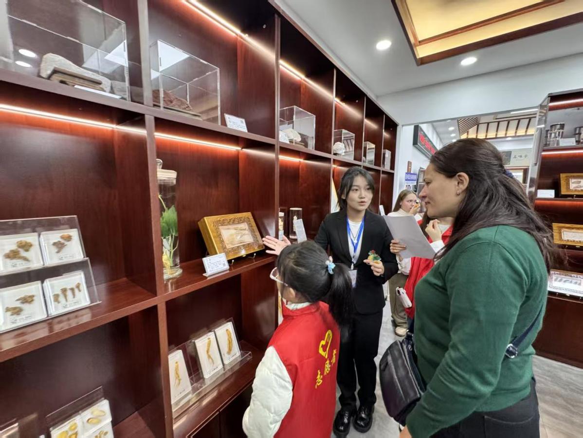在自由参观环节,同学们接连提出各种奇思妙想的问题,如人参和西洋参有什么区别?玉米须有什么用处?……。讲解员一一耐心解答,现场气氛热烈而融洽。在动物类药材展区与针灸铜人模型前,同学们长时间驻足观摩讨论,表现出对中医药独特诊疗方法与药材世界的浓厚兴趣。