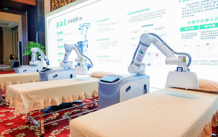 据悉,热敏灸技术曾荣获国家科技进步奖二等奖。热敏灸机器人是依据“腧穴敏化”“灸之要,气至而有效”“辨敏施灸”原创理论,植入陈日新教授原创的施灸得气手法,实现“探敏定位、辨敏选优、灸敏得气、敏消量足”技术要求,历时多年精心研发成功的中医高科技设备。热敏灸机器人具有三大功能,得气快:植入了得气有效施灸手法,能够充分发挥热敏穴位的放大效应;得气强:内置变频动灸手法,充分调动人体固有自愈潜能,实现系统级的自我修复与功能康复;得气时间长:采用了陈日新团队自主研发的艾热反射发生器,不需要掸灰,能够量效最大化。