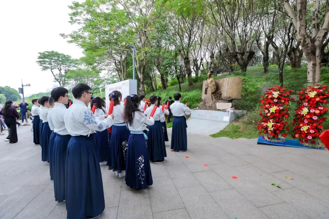 座谈会结束后,与会人员来到医圣张仲景雕塑前。随着庄重的《医圣颂》奏响,医圣张仲景雕像正式落地揭幕,现场人员纷纷向雕像敬献鲜花。在医圣雕像的注视与见证下,非遗传承队员们进行了拜师仪式。
