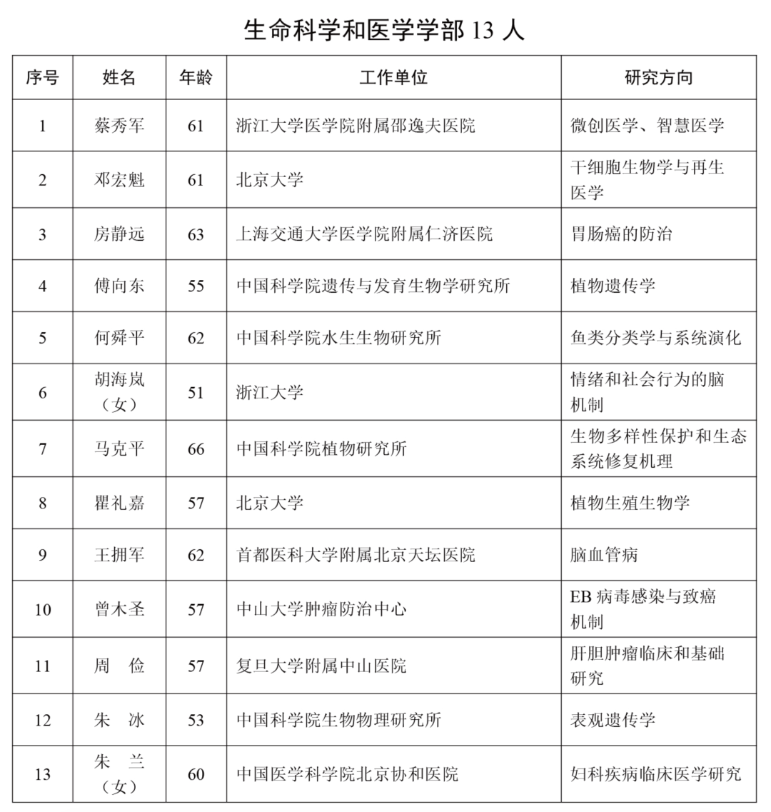 以下为中国科学院“生命科学和医学学部”、中国工程院“医药卫生学部”2025年院士增选当选院士名单:
