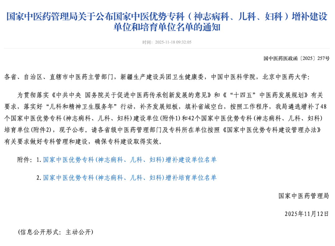 此次48个国家中医优势专科(神志病科、儿科、妇科)增补建设单位包括中国中医科学院广安门医院、望京医院等单位的22个科室作为神志病科建设单位,河北省中医院、上海中医药大学附属岳阳中西医结合医院等单位的10个科室作为儿科建设单位,中国中医科学院西苑医院、天津中医药大学第一附属医院等单位的16个科室作为妇科建设单位。42个国家中医优势专科(神志病科、儿科、妇科)增补培育单位包括北京中医药大学东直门医院、北京市昌平区中西医结合医院等单位的19个科室作为神志病科培育单位,中国中医科学院西苑医院、广安门医院等单位的16个科室作为儿科培育单位,中国中医科学院望京医院、北京中医药大学东方医院等单位的7个科室作为妇科培育单位。