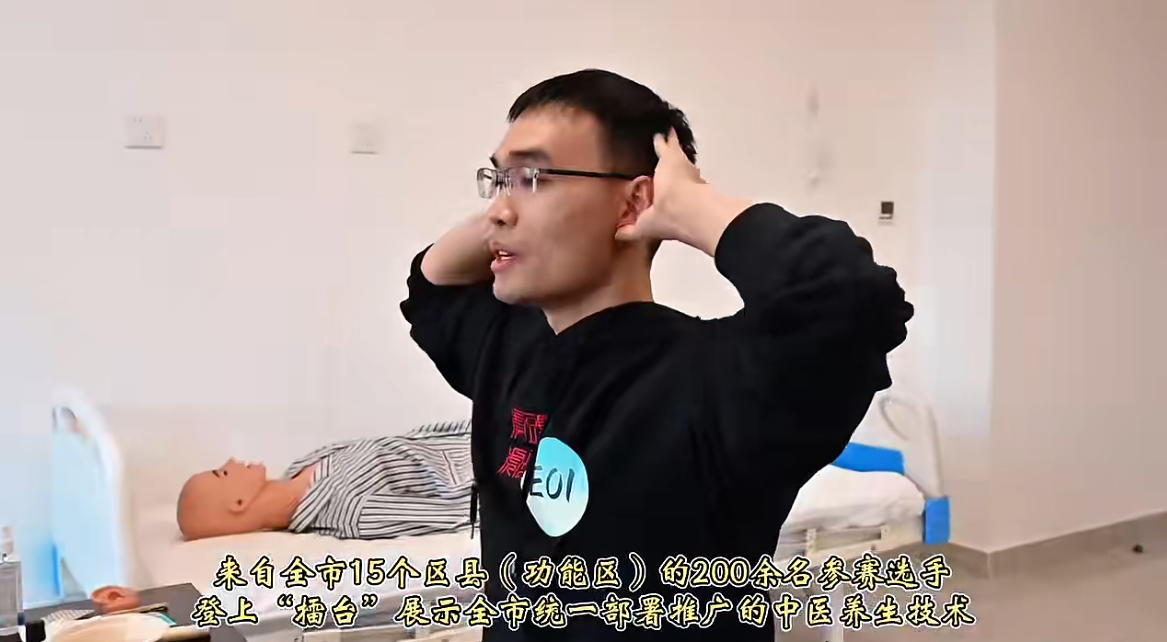这场全民参与的赛事,更像是一场精彩纷呈的中医养生展示盛会,选手们精神饱满、各展所长。中医养生技术技能展示环节更是高潮迭起。选手们从穴位按揉缓解视疲劳、艾灸神阙穴缓解肠胃不适、小儿摩腹强身保健、廉泉穴揪痧缓解咽喉疼痛、颈肩养生操、耳穴压豆助眠等9项市级专家组遴选确定的安全可靠、易学有效的指定技术中任选2项,一边熟练操作一边详细讲解操作要点和养生原理。