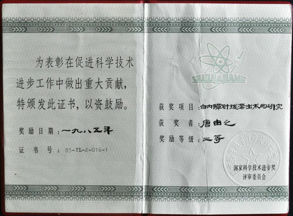 1985年,“白内障针拨套出术的研究”获得国家科学技术进步奖二等奖。(广安门医院供图)