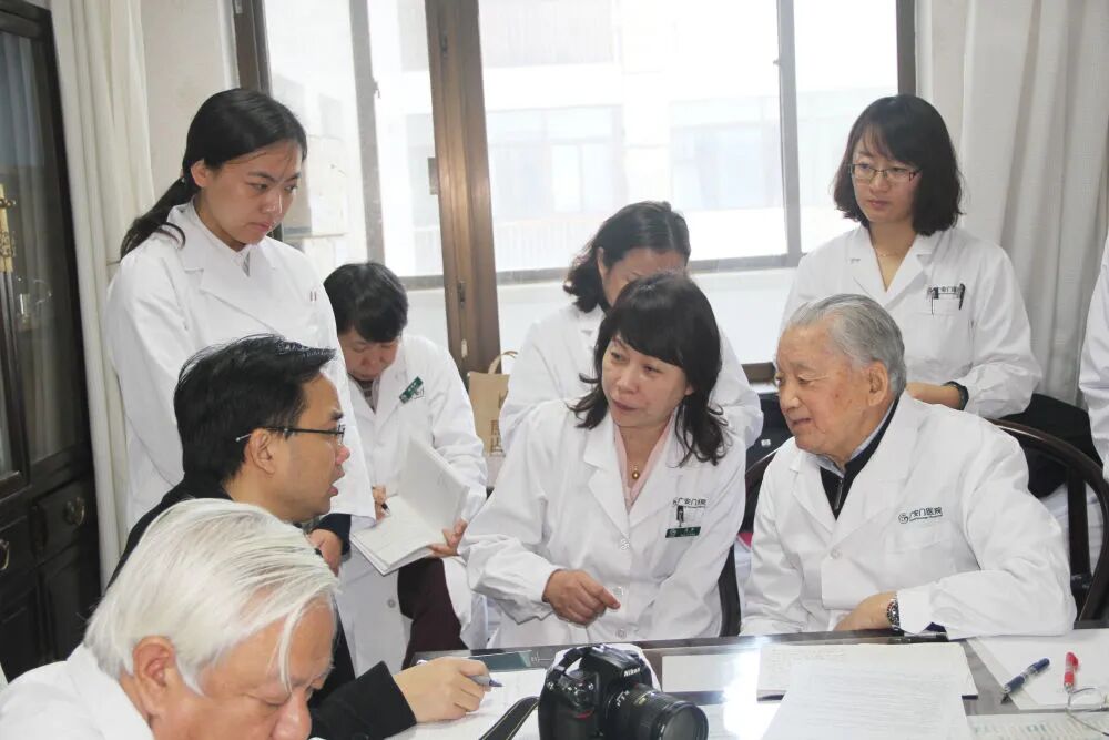 姜泉(前排右二)跟随路志正(前排右一)为患者看诊。(广安门医院供图)