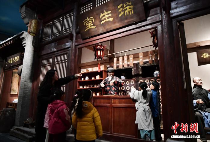 12月16日,河北安国中医药文化博物馆,小朋友参观仿古药市街。中新社记者 翟羽佳 摄