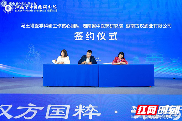 湖南省中医药研究院、马王堆医学科研工作核心团队、湖南古汉酒业有限公司现场签署三方合作协议。