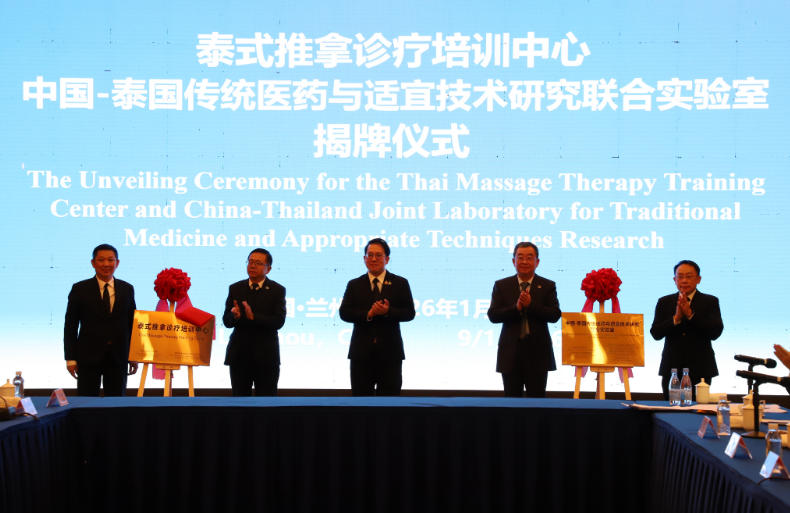 泰国卫生部长帕塔纳·蓬帕、泰国卫生部常务次长颂乐·江斯曼、泰国卫生部传统和替代医学司副司长特万·塔尼拉、甘肃中医药大学党委书记王学军、甘肃中医药大学附属医院党委书记吴冰为两大合作平台揭牌。