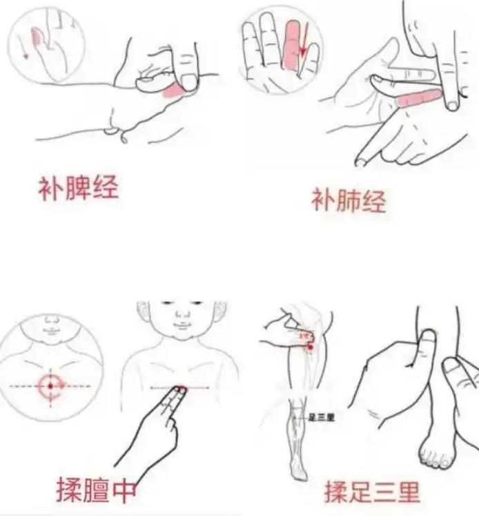 小儿推拿:在医师指导下,家长可学习一些基础保健手法。如:补脾经、补肺经各200-300次,揉膻中、按揉足三里50-100次,有助增强肺脾功能。