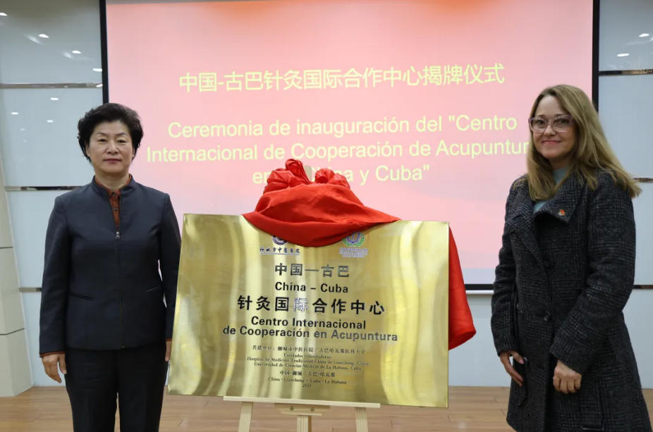 张月莲与努里亚·里韦罗·马丁内斯共同为“中国—古巴针灸国际合作中心”揭牌。