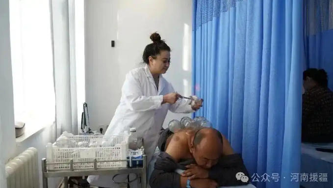 伊吾县人民医院中医科医生在给病人拔罐治疗